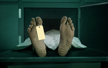 Male human body lying dead at morgue capsule with blank identification label . Close up foot of man cadaver covered with sheet having indentity tag on toe in death concept