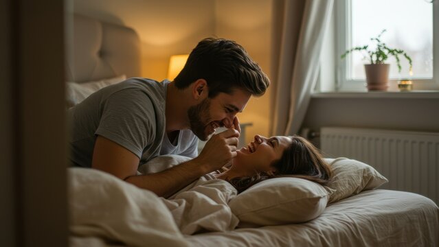 Young Caucasian couple in intimate moment at home, sharing laughter in cozy bedroom Themes of love, intimacy, wellness