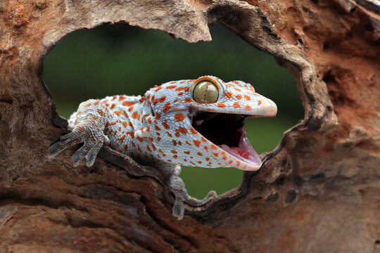 Close-up of a tokay gecko gekko perched on log with its mouth open