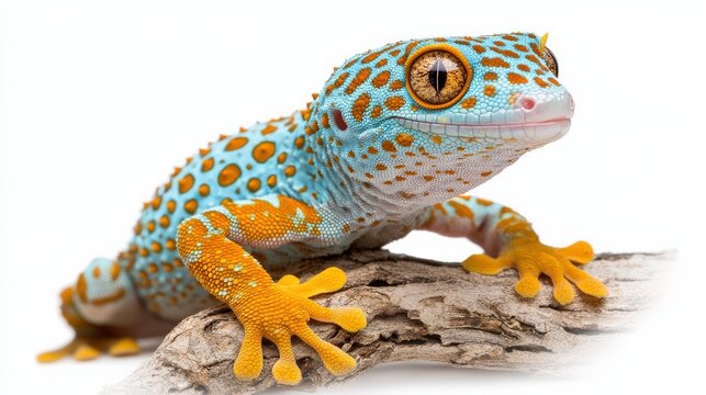 Unusual bright green tokay gecko clinging to a branch, isolated on a white background.
