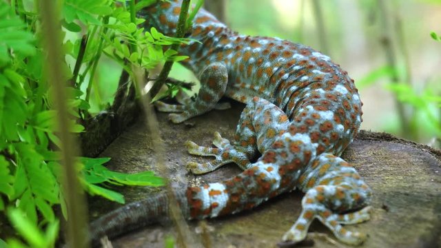 Tokay gecko resting in a tree close up. The tokay gecko (Gekko gecko) is a nocturnal arboreal gecko in the genus Gekko.