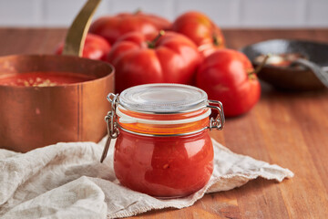 Tomato sauce in a glass jar, tomatoes and herbs on its side.