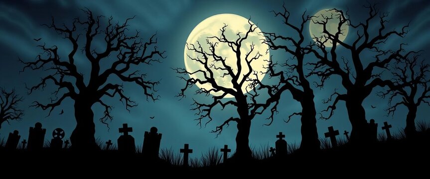 Abstract Halloween background featuring a dark silhouette of gnarled trees and tombstones against a moonlit sky,   graveyard background,  scary