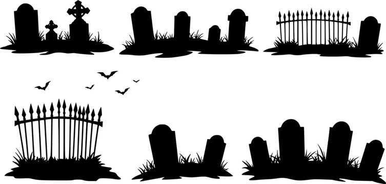 Halloween graveyard silhouettes. Creepy gravestones, tombstones and scary fences vector illustration set. Halloween graveyard spooky silhouettes