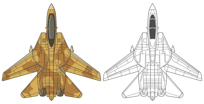 Set F-14 tomcat military aircraft design in line art and colored style from top view. Vector illustrations colorful f14 fighter jet. Outline drawing combat aircraft. United states modern airplane.