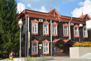 Vintage wooden Russian-German house with ornamental frames in Tomsk city, Russia. Russian folk style in architecture. Tomsk landmark, Tomsk monument, cityscape, view. Snow winter, cold season. Siberia