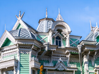Fragment of old wooden house built in the 19th century in the Siberian city of Tomsk, Russia