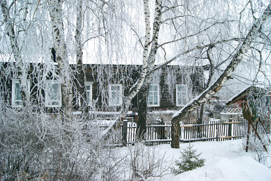 A traditional wooden house, a picket fence and a snowy yard with frost-covered birch trees in Siberia. Concepts of harsh winter conditions, rural Russian dwelling, and traditional taiga architecture.