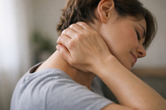 Young woman holding and massaging her neck in pain or discomfort, concept of muscle tension, stress, wellness, and self-care at home.