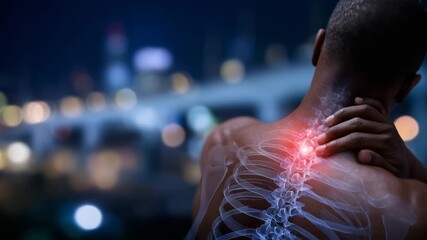 Realistic photo of a man holding his neck with transparent spine overlay showing cervical vertebrae pain, inflammation, or injury in the upper back