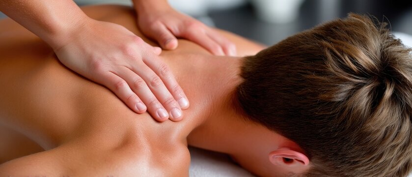 Young man receives neck massage from doctor in clinic for pain relief and joint therapy during session with professional support