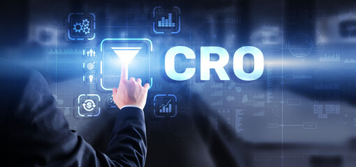 Conversion Rate Optimization. CRO Technology Finance concept Businessman pressing on a virtual screen
