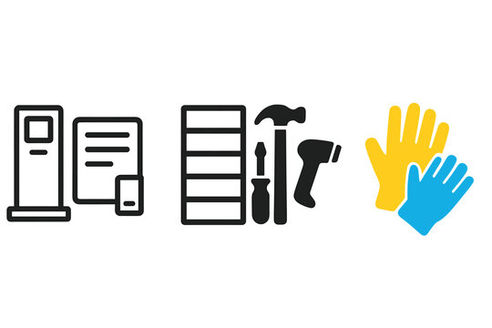 Tool Library Icons. Linear minimalistic tool libraries icon: rental system kiosk, maintenance logbook, storage shelves, hand tools