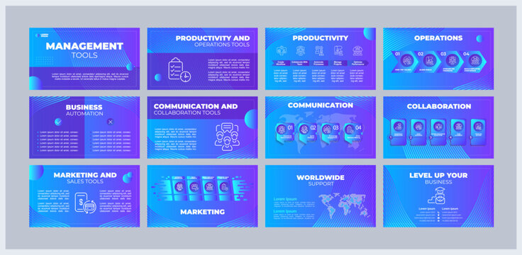 Management tools presentation templates set. Organizational change. Business software. Company strategy. Ready made PPT slides on blue background. Graphic design. Montserrat, Arial fonts used
