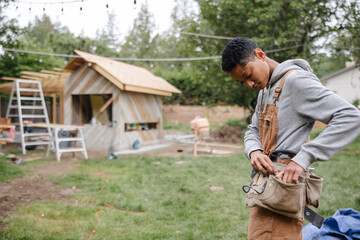 Capenter putting on her toolbelt before work