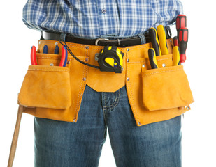 contractor  man wearing carpenter toolbelt on white