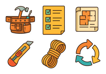 Construction tools and planning icons featuring toolbelt and floor plan