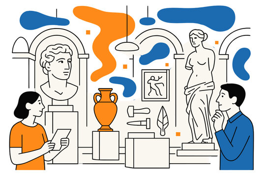 Cultural Heritage Exhibition. Historical showcase. A museum atrium with exhibits of sculptures, ancient tools,