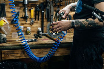Bike mechanic air cleaning the cassette