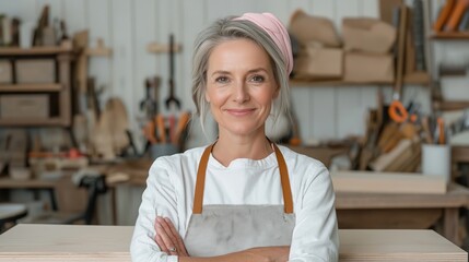 Confident female carpenter in workshop embracing craftsmanship and creativity