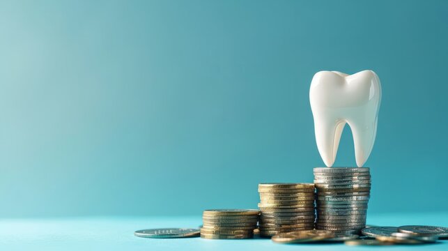 Dental health and wealth tooth sitting on stack of coins on blue background business and medical concepthorizontal photo