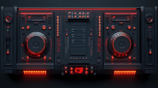 Futuristic DJ mixer console with red lights, top view, 3D render. Perfect for music production, mixing, and electronic dance music.