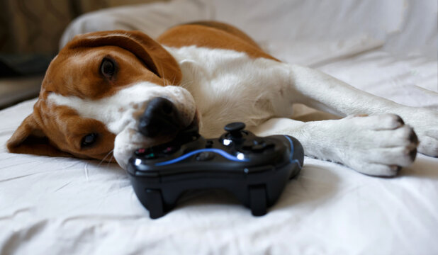 dog's paws lie on the game joystick top view