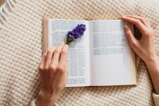 top view of young woman reading book with purple flower