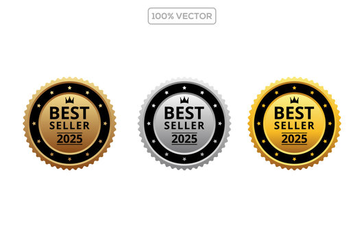 round black and gold best seller 2025 badges with crown icon for top rated product label