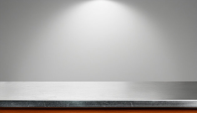 Silver steel countertop, empty shelf. realistic mockup of table top, kitchen counter on gray background with spot light. Bar desk surface in foreground