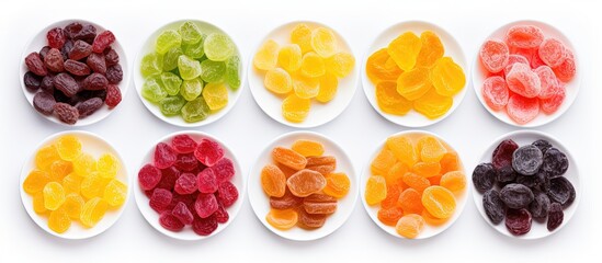 Multicolored candied fruits isolated on white top view with copyspace for text
