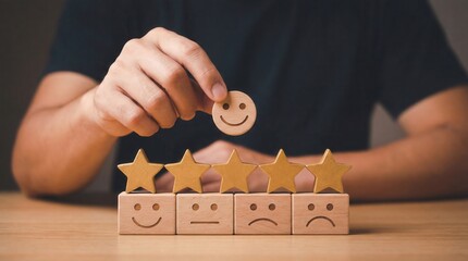 A hand places a happy face wooden icon over five golden star blocks signifying top tier excellent customer service and product feedback on a clean wooden table