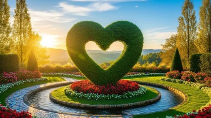 Heart-shaped topiary in a beautifully landscaped garden at sunrise.relevan