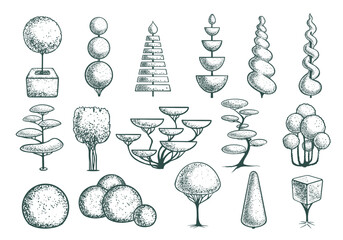 Seth sketch topiary tree shapes. Geometric trees for advertising and landscape design. Isolated on white background. Vector.