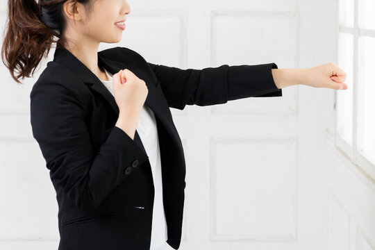パンチのジェスチャーをする若いビジネスウーマン