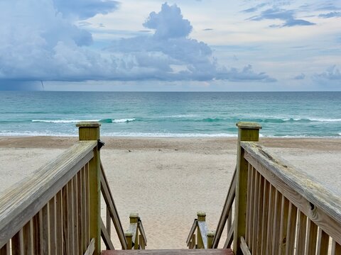 wooden pier on the beach with waterspout out at sea