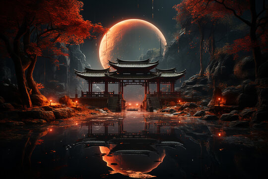 3d rendering of an old japanese shrine with red torii gate and wooden illuminated lantern at foggy night