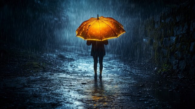 A figure shielded by a glowing umbrella from torrential rain urban alley night scene atmospheric perspective resilience