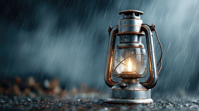 Lantern in Rain: An antique lantern glows warmly amidst a torrential downpour, illuminating the scene with a sense of nostalgia and resilience.