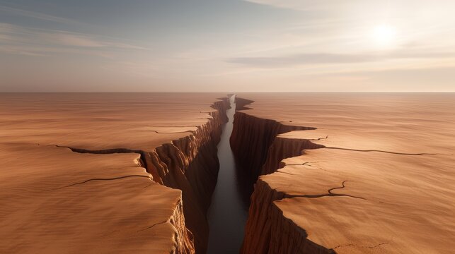 Parched riverbed with deep fissures, baking under a torrid sun, distant heat haze, dramatic weather conditions, high-resolution