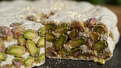 Delicious traditional Italian nougat also known as torrone generously filled with vibrant green pistachios and dusted with powdered sugar showcasing its rich texture and gourmet quality a perfect swe.