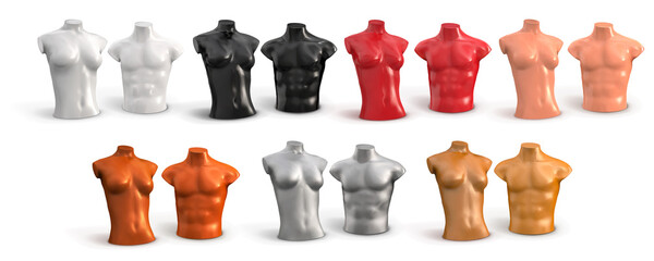 Mannequin of female and male torso plastic color. Human naked body, chest, bust. Vector 3d illustration isolated on white background. Part of the body.