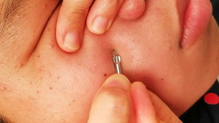 Torture and pain suffer from squeezing pimple blackheads from the face of a teenager with a blackhead popper