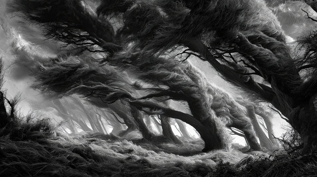 A forest howling with wind, trees bending like tortured souls