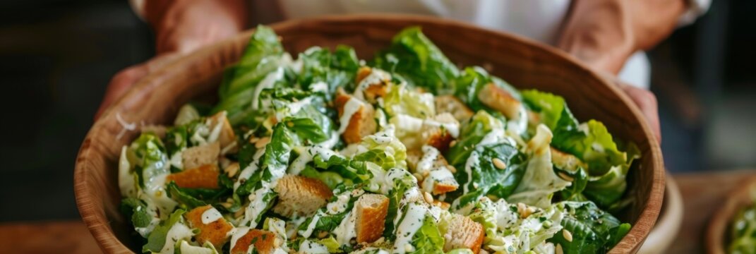 A mouthwatering shot of a grilled romaine Caesar salad being tossed in a large wooden bowl perfectly coated in the creamy dressing.