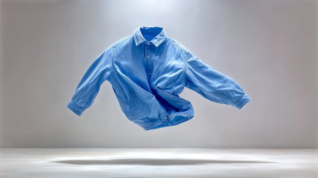 Blue shirt is flying in the air. The shirt is upside down and he is in a state of disarray. Concept of chaos and disorder, as if the shirt has been tossed around carelessly