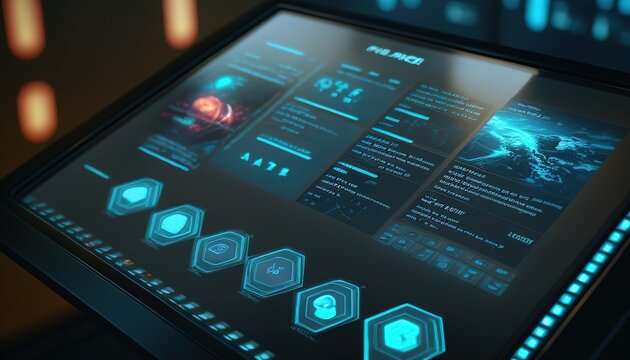 Infographic hologram backdrop template ultraviolet neon background coder programmer computer security system software man coder touch air space interface digital cyber technology virtual screen icon