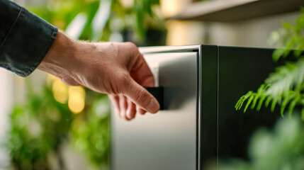 Hand of a person opening a modern metallic kitchen cabinet handle with blurred indoor plants in soft natural light background for home design concept