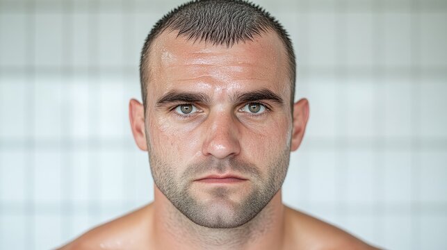 A high-resolution portrait shows a mans face, displaying a serious expression. He has short, dark hair and a strong jawline. The background is a blurred, light-grey tiled wall. The lighting is even,