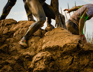 Muddy obstacle race runner in action. Mud run
